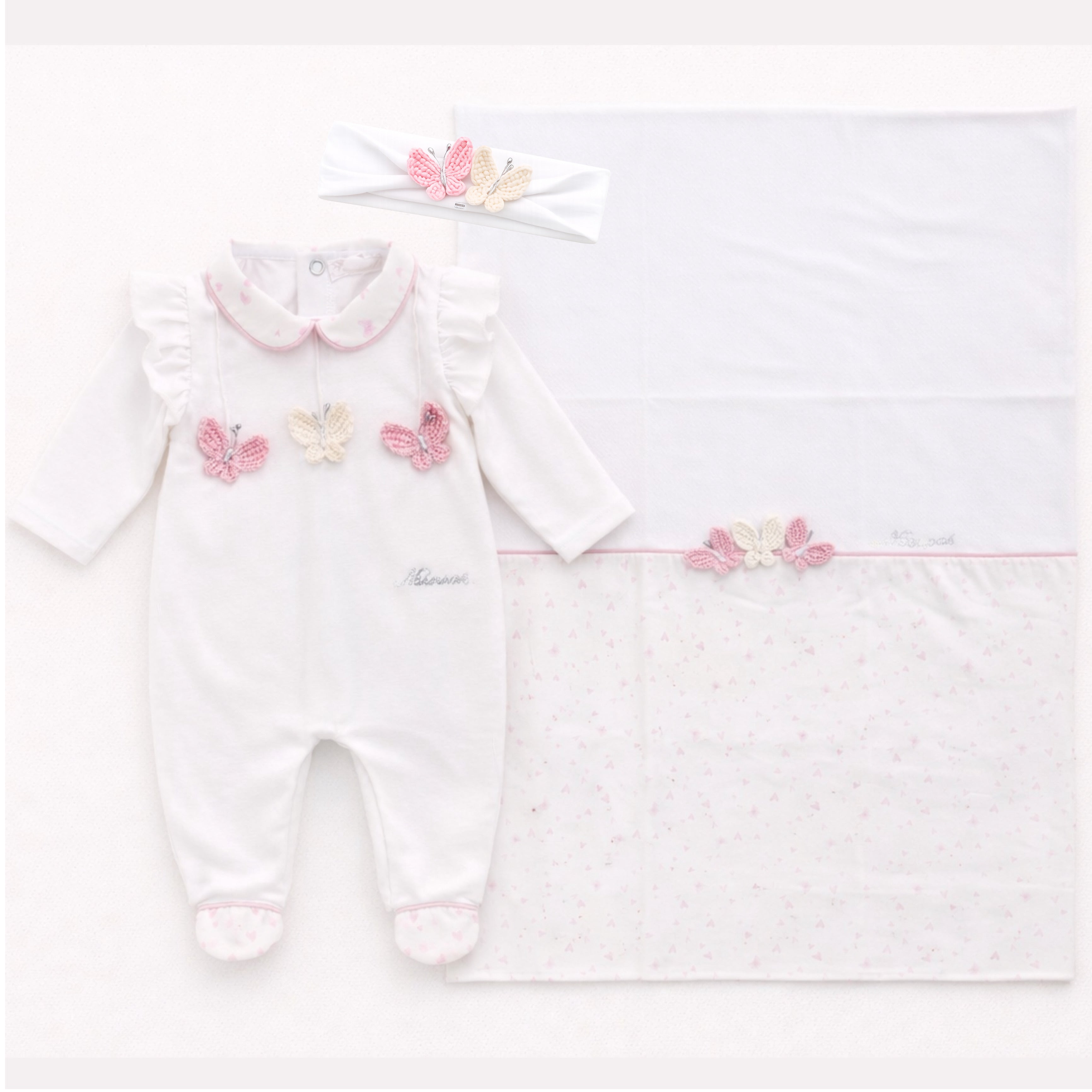 The matching blanket is finished with subtle pink detailing and coordinating butterfly embellishment, making it ideal for pram use, nursery styling or as a treasured keepsake.