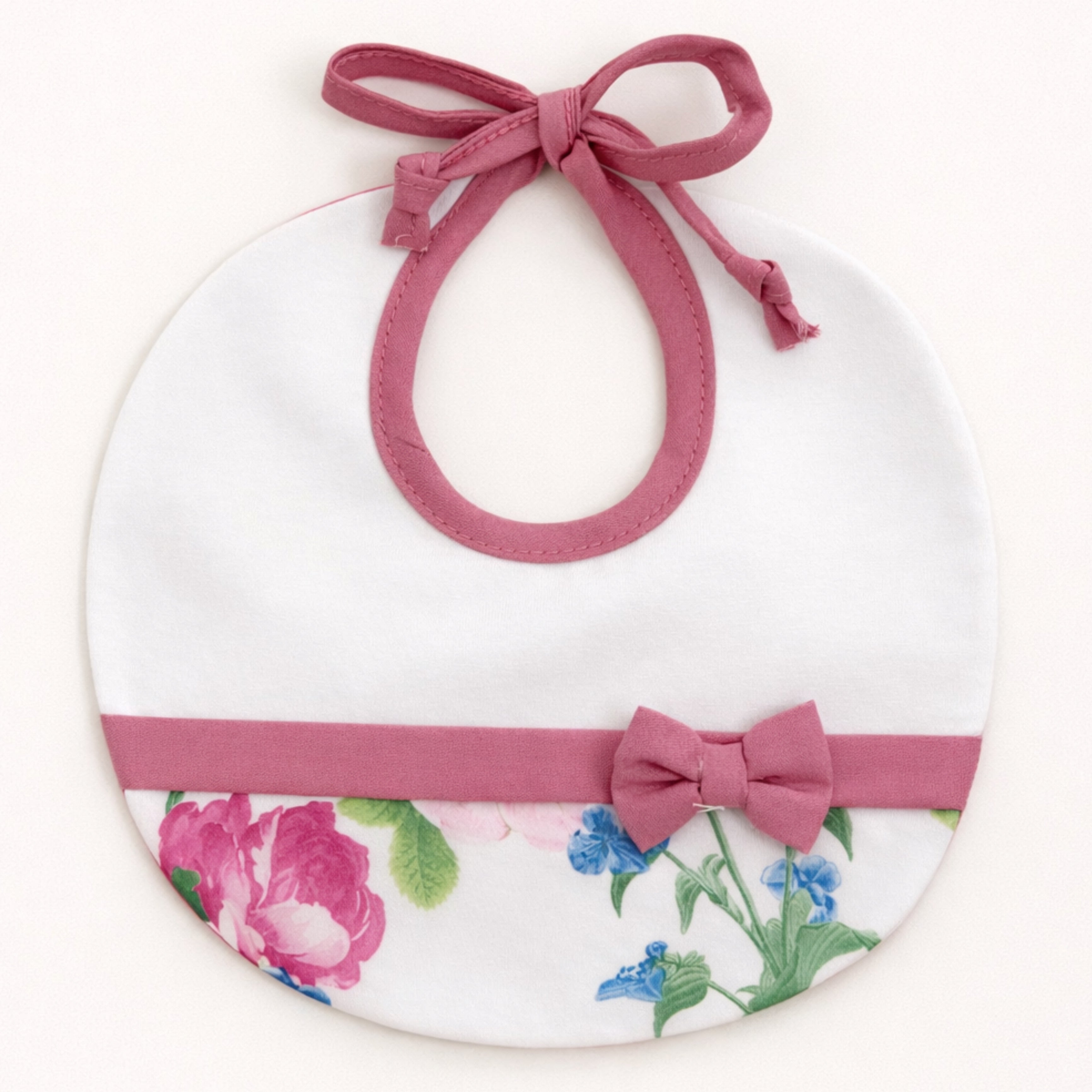 The bib features a soft white cotton upper panel with a delicate floral print lower section, finished with refined pink trim and a matching bow detail. The adjustable tie fastening ensures a comfortable fit, while the gentle cotton fabric is kind to delicate skin.