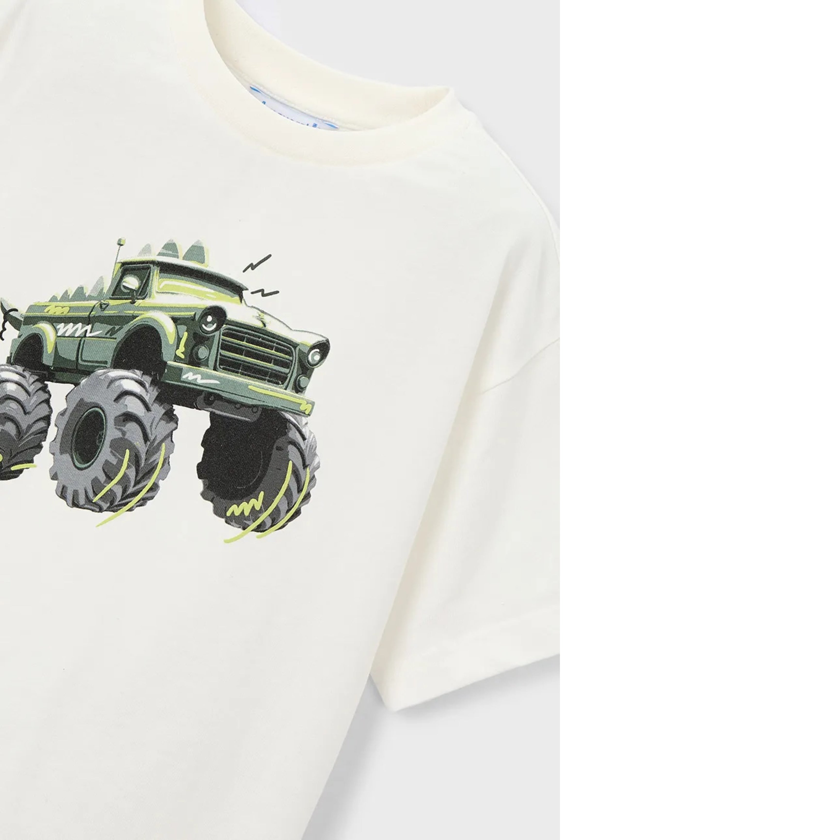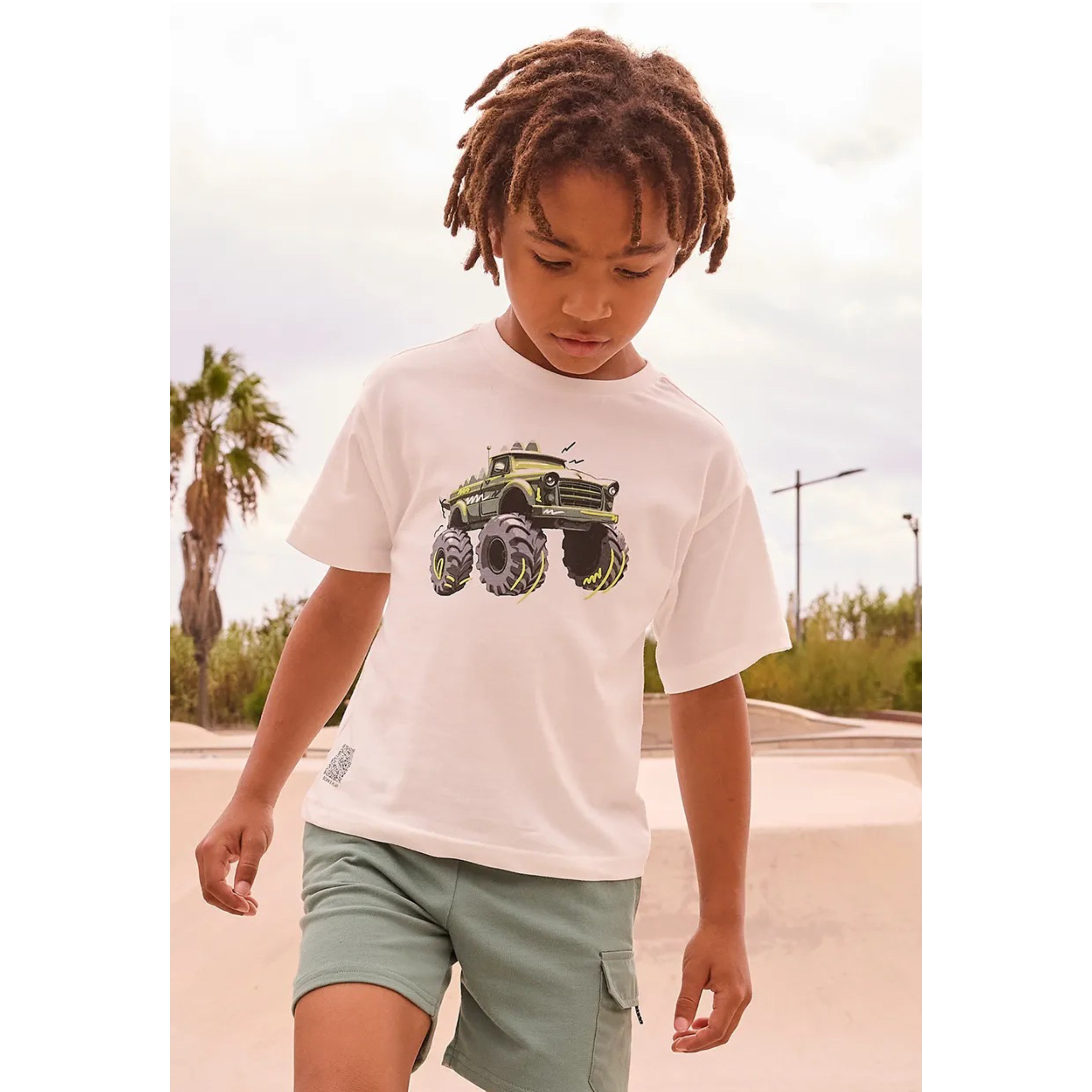 Cool, comfortable and perfect for everyday adventures, this stylish Mayoral boys two-piece outfit is part of the Summer 2026 collection. The soft white cotton t-shirt features a bold monster truck graphic, adding a fun and playful edge little boys will love. Paired with lightweight sage green shorts, designed for comfort and easy movement, this outfit is ideal for warm days, holidays and active play.