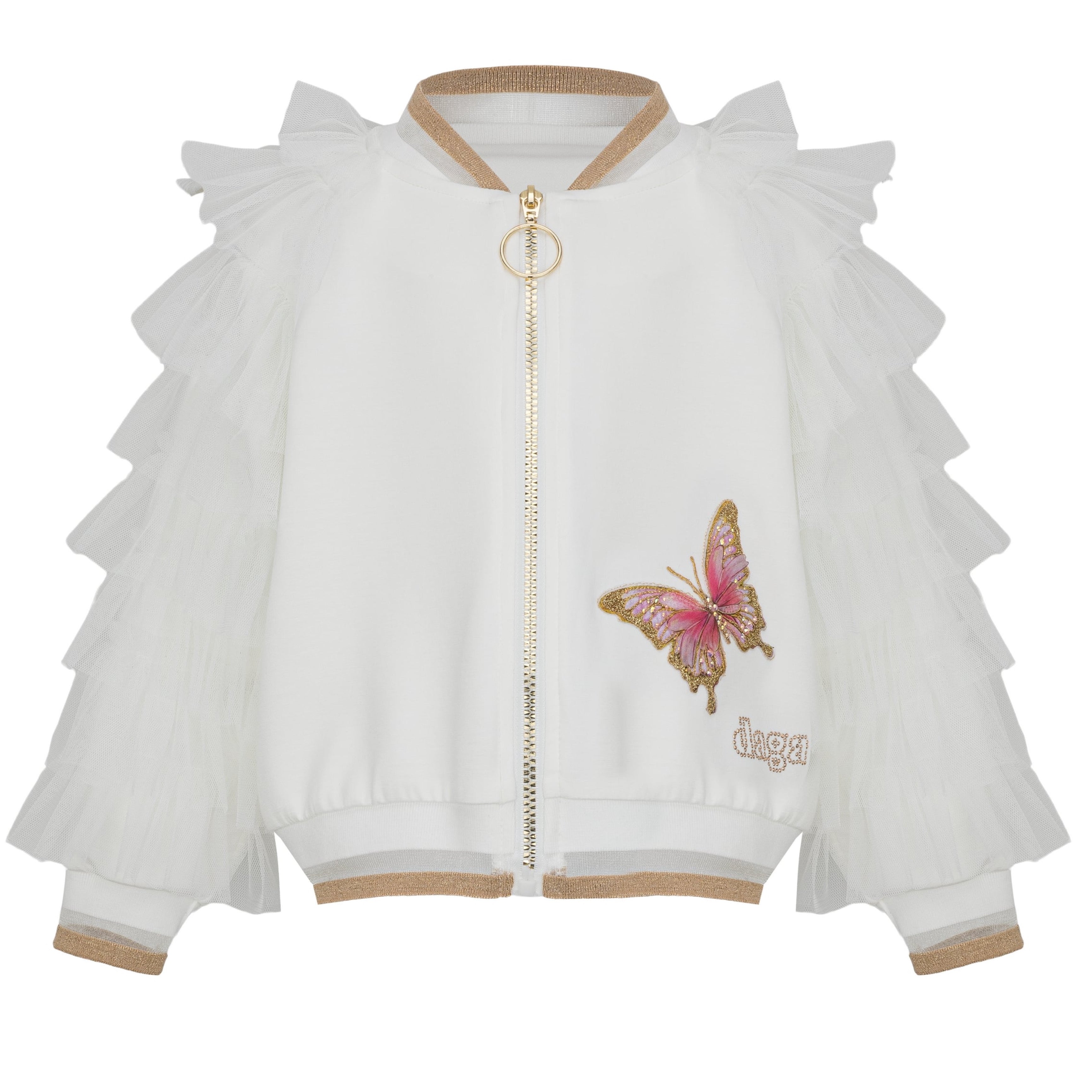 The Daga girls butterfly tulle jacket from the Twinkle Flight Collection is a stunning luxury layering piece, designed to add a magical finishing touch to any outfit. Crafted in soft ivory with dramatic tulle ruffle sleeves and a shimmering butterfly appliqué, it is perfect for parties, special occasions and fairy-inspired looks.