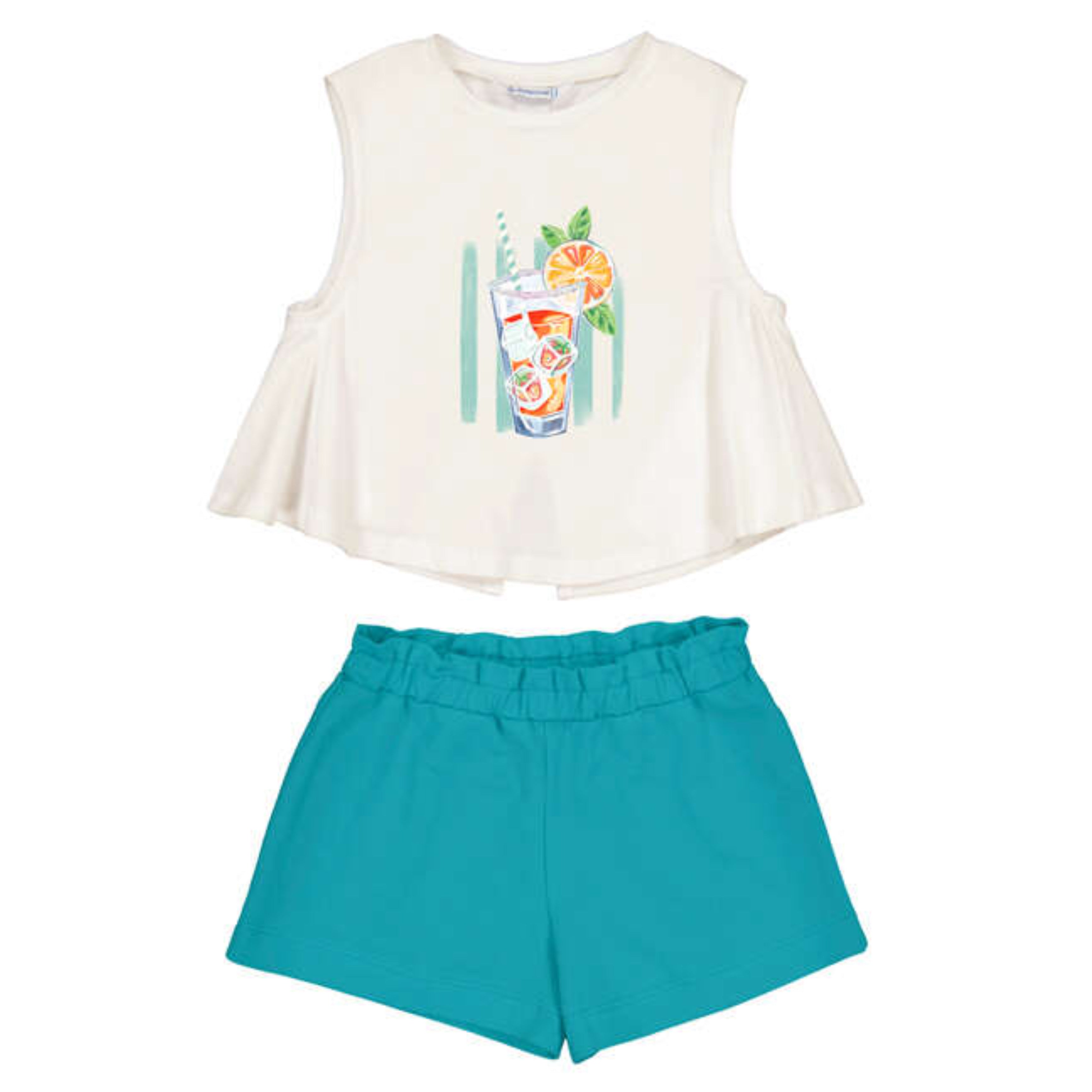Fresh, playful and perfect for sunny days, this beautiful Mayoral girls two-piece set is part of the Summer 2026 collection. The lightweight cream sleeveless top features a charming citrus drink illustration, finished with soft gathered side panels for a floaty, feminine silhouette. Paired with vibrant teal shorts with a comfortable elasticated waistband, this outfit is designed for warm-weather comfort with a stylish summer feel.