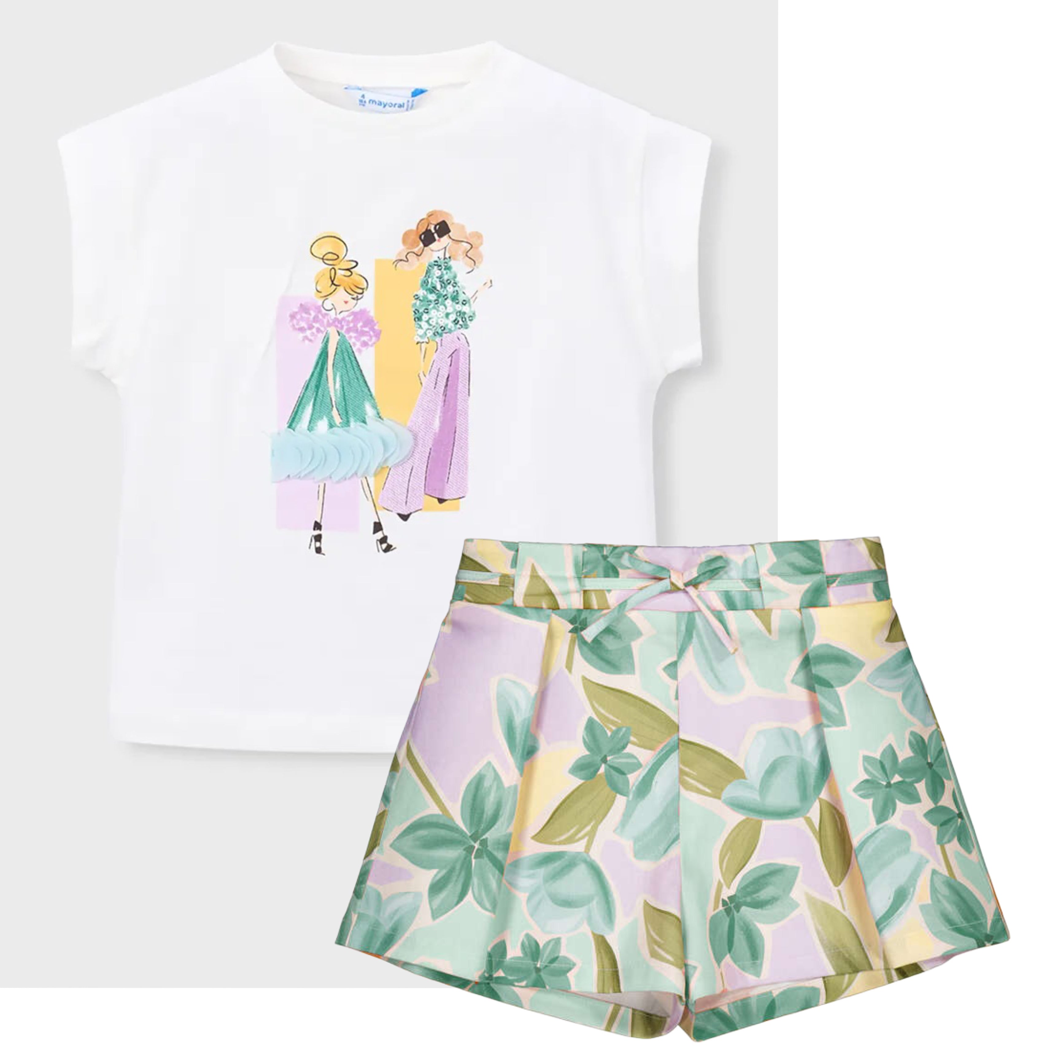 The soft white cotton t-shirt features a stylish illustrated girl print in delicate pastel tones, adding a fashion-forward touch. It’s perfectly paired with lightweight tailored shorts in a soft pastel floral print, finished with a neat waist tie for a polished look.
