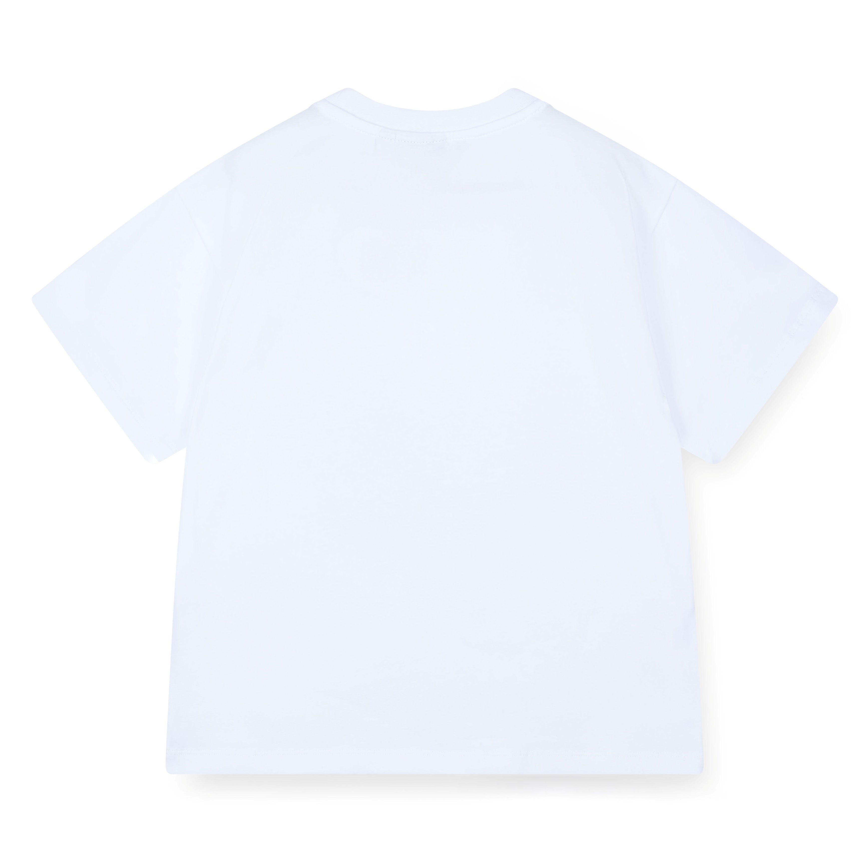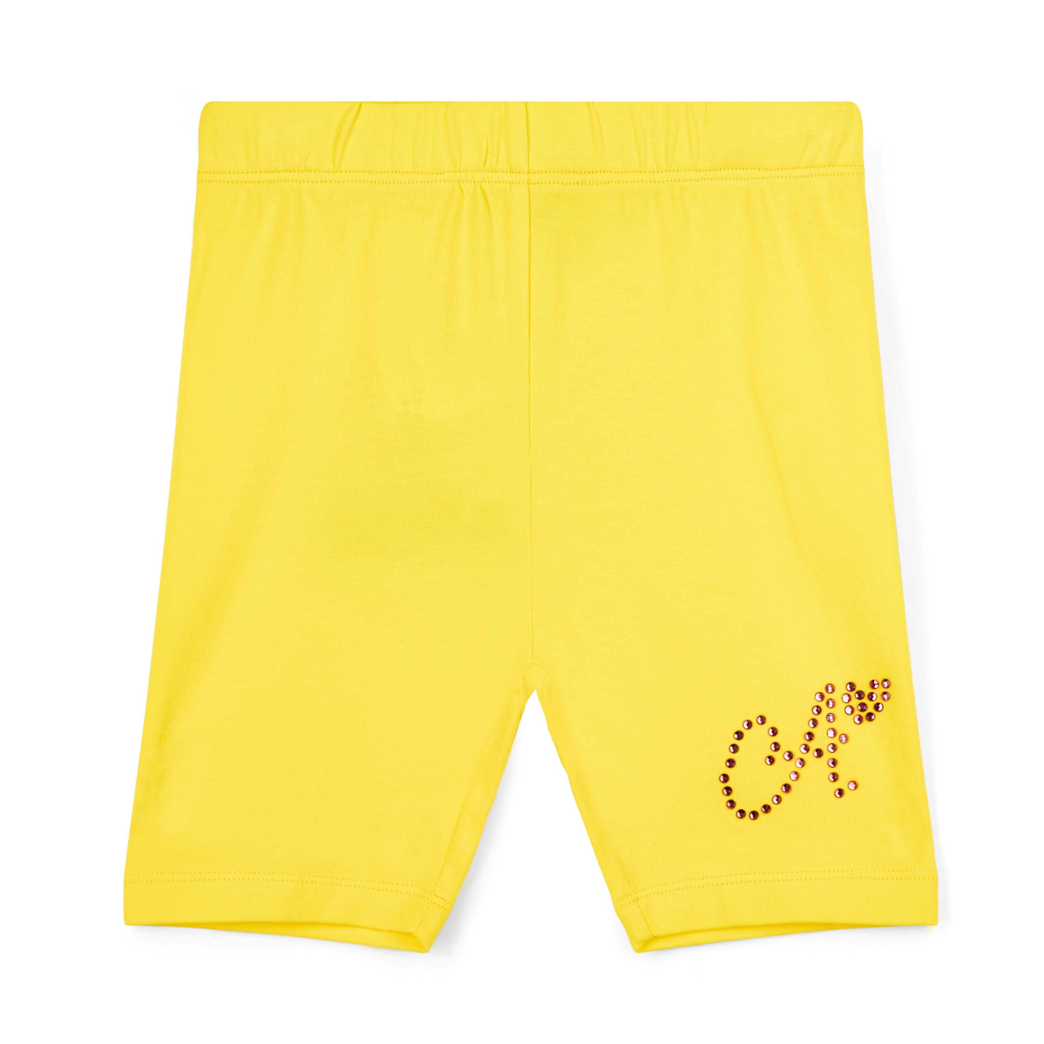 The Trinity short set features an oversized Tutti Fruitti print t-shir, paired with yellow cycling shorts finished with dimante logo on one leg.