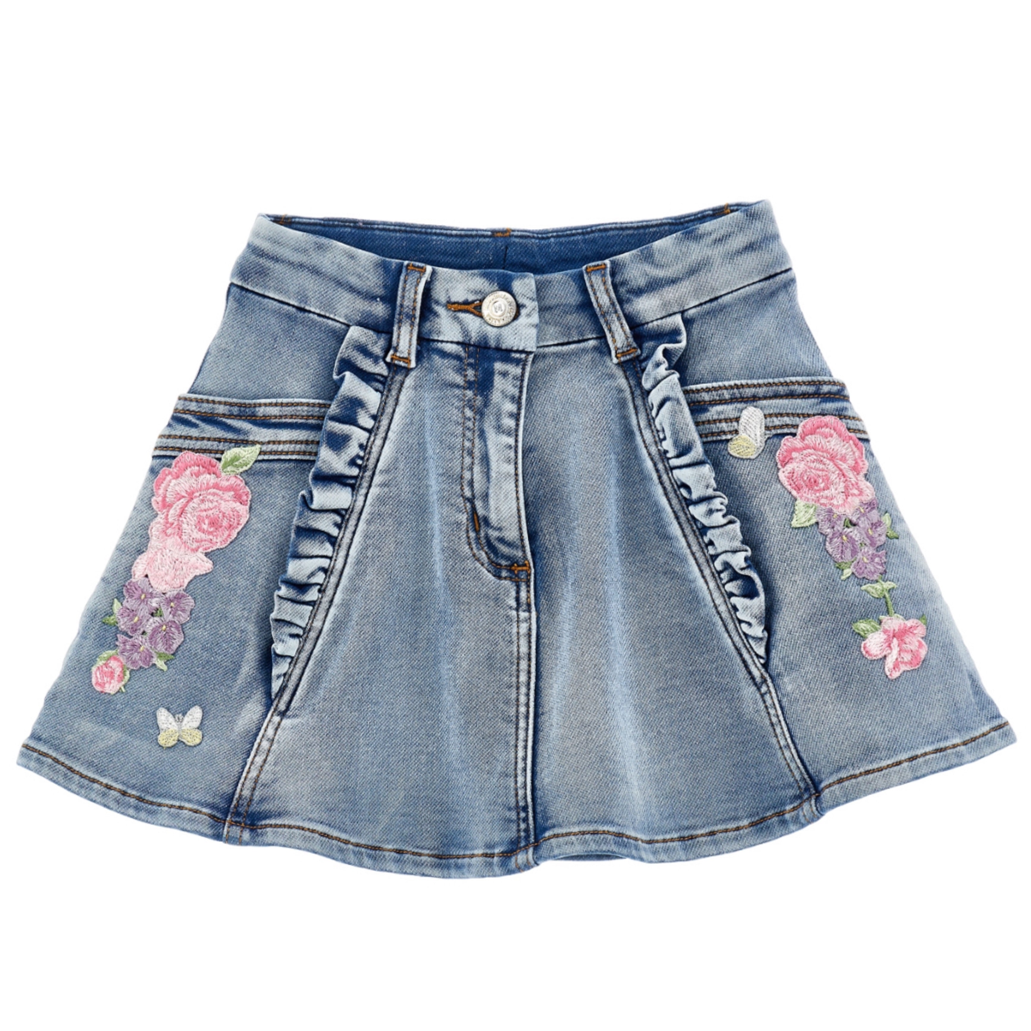 This Monnalisa Girls “Be Free” T-Shirt & Denim Skirt Set is the perfect blend of comfort and luxury. The soft white cotton t-shirt features a vintage camper van and pink floral print with sparkling rhinestone “Be Free” lettering. Paired with a blue denim skirt detailed with pink and lilac embroidered flowers and ruffle trims, this outfit brings effortless charm to your little one’s wardrobe.
