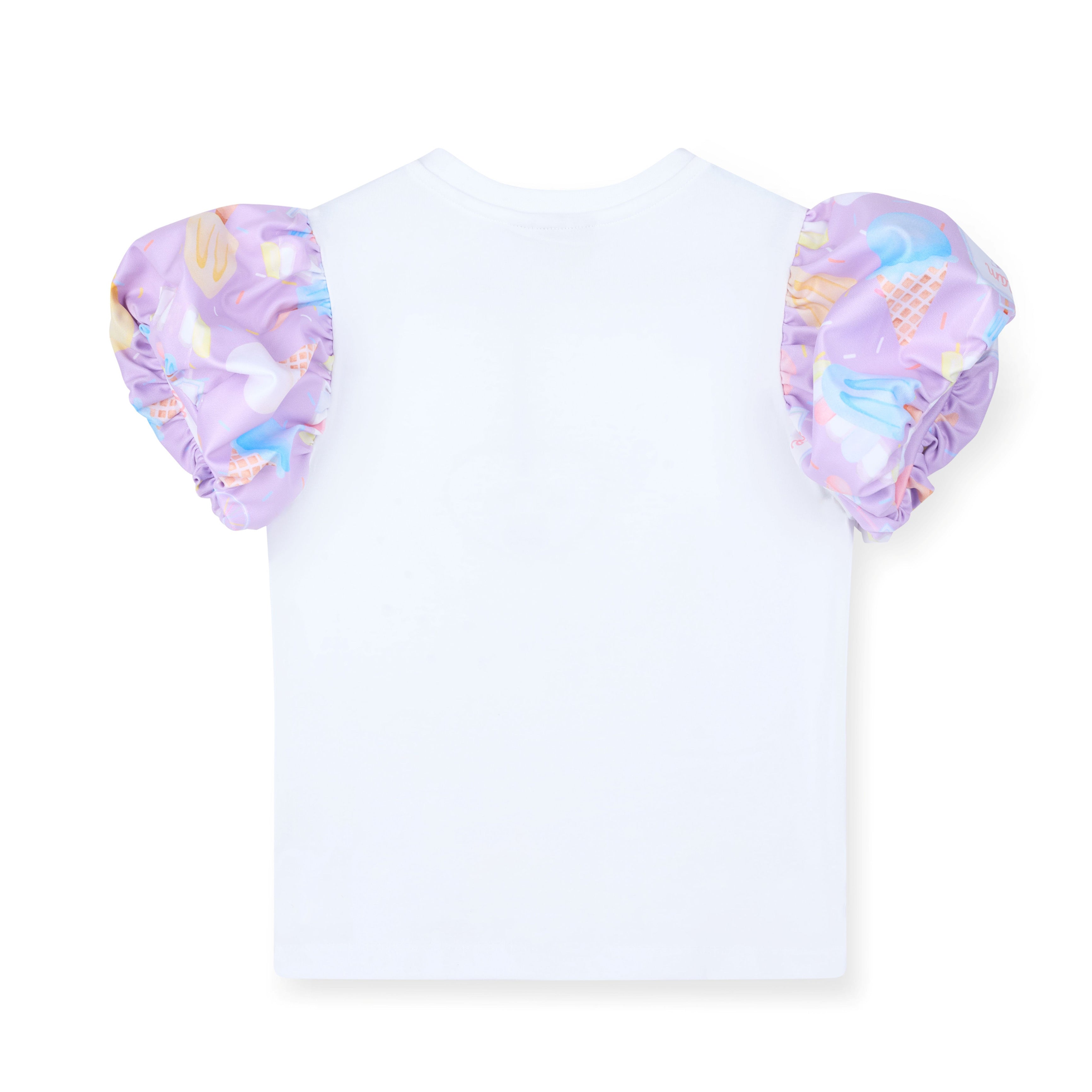 The Sally skirt set comes with a white jersey top featuring an ice cream artwork on the front and ice cream print puff sleeves. The pleated skirt is made in matching ice cream print and has a striped waistband for comfortable fit.