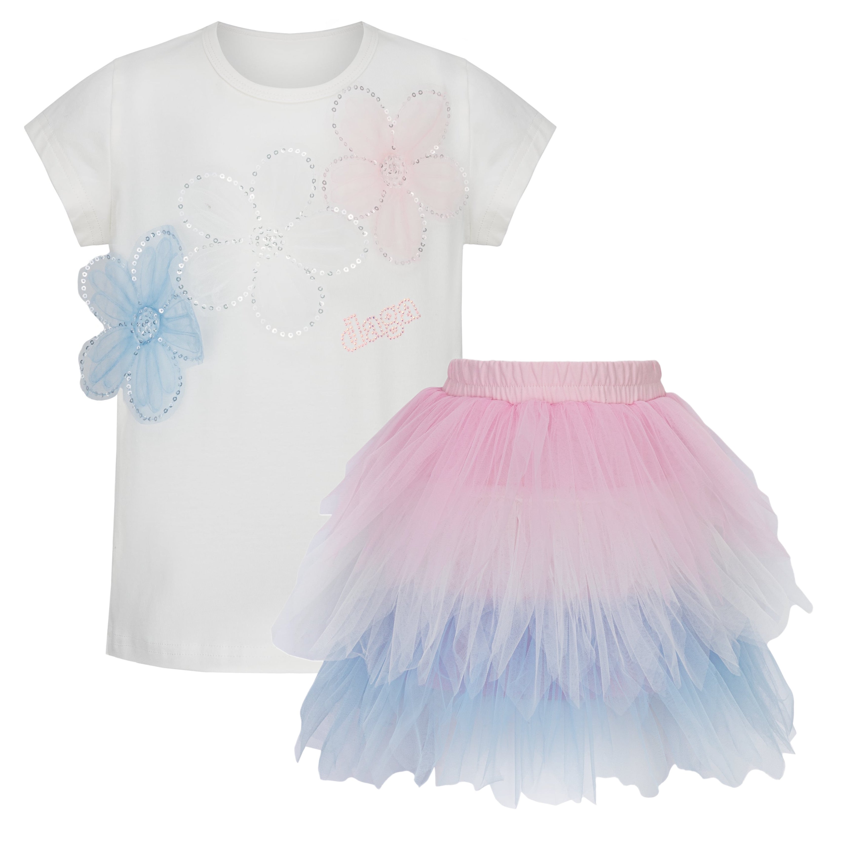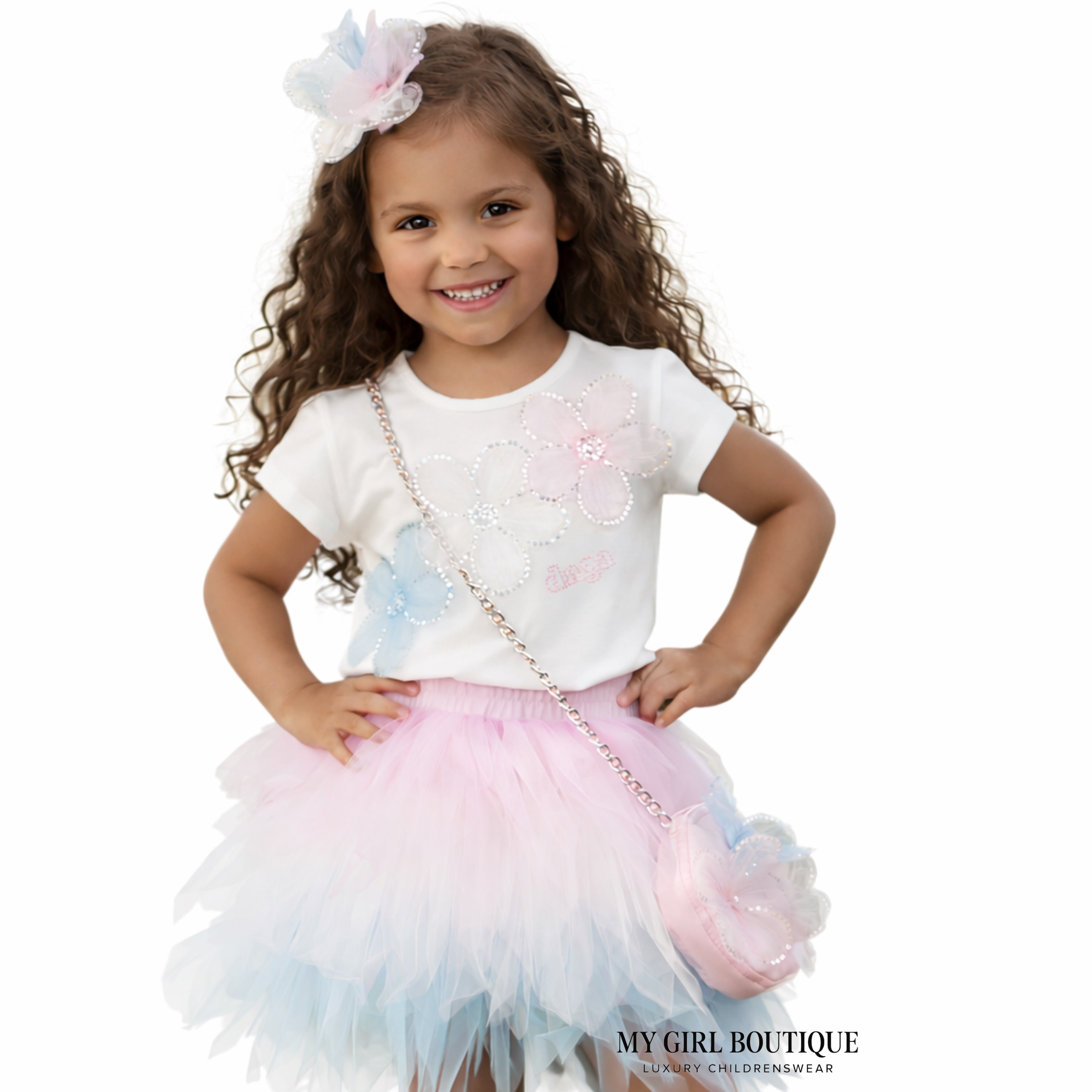 The Daga girls floral tulle ceremony outfit is a beautiful two-piece set from the Daga Ceremony Collection. Featuring a soft short-sleeved top with floral tulle appliqué and a layered pastel tulle skirt, it is perfect for weddings, flower girls and special occasions.