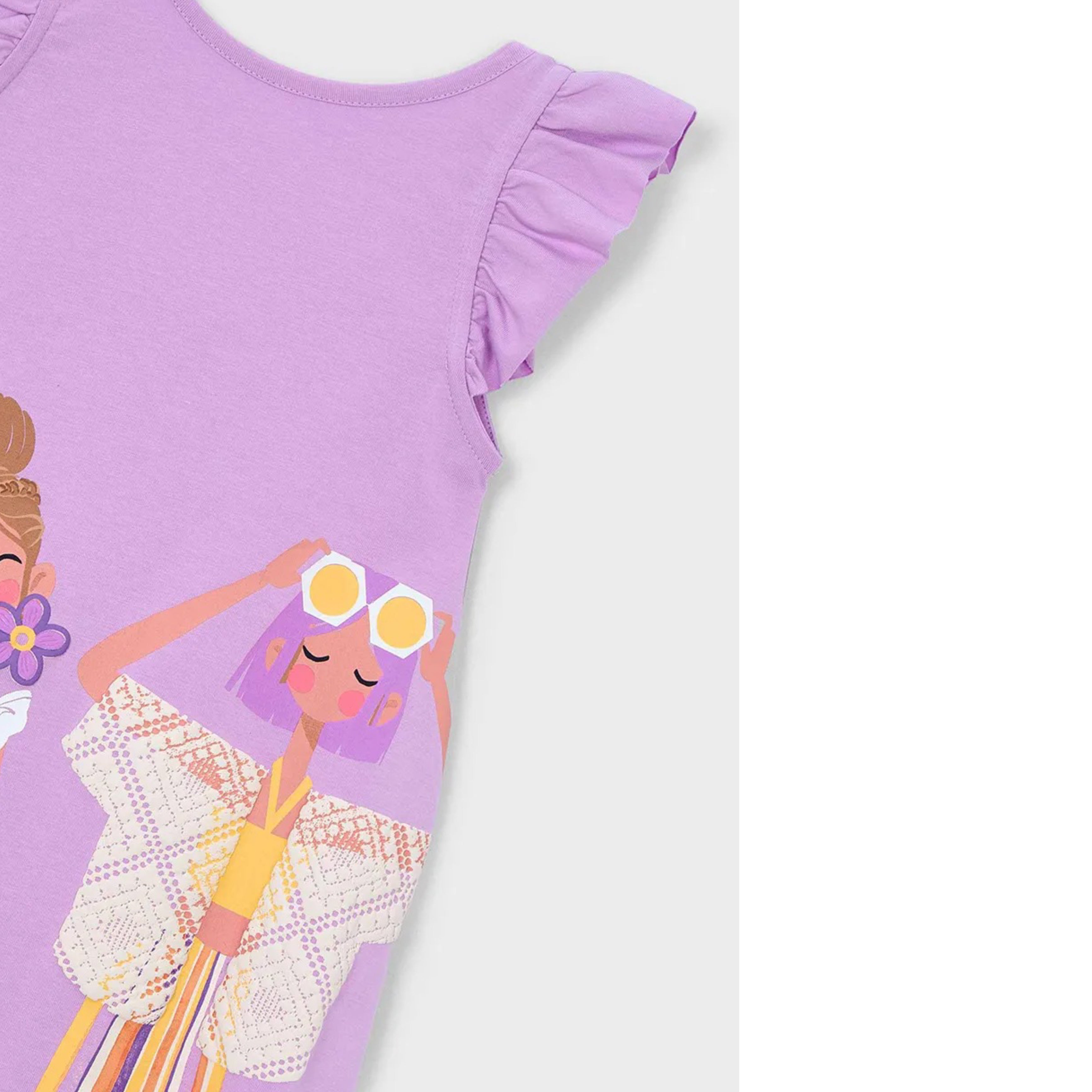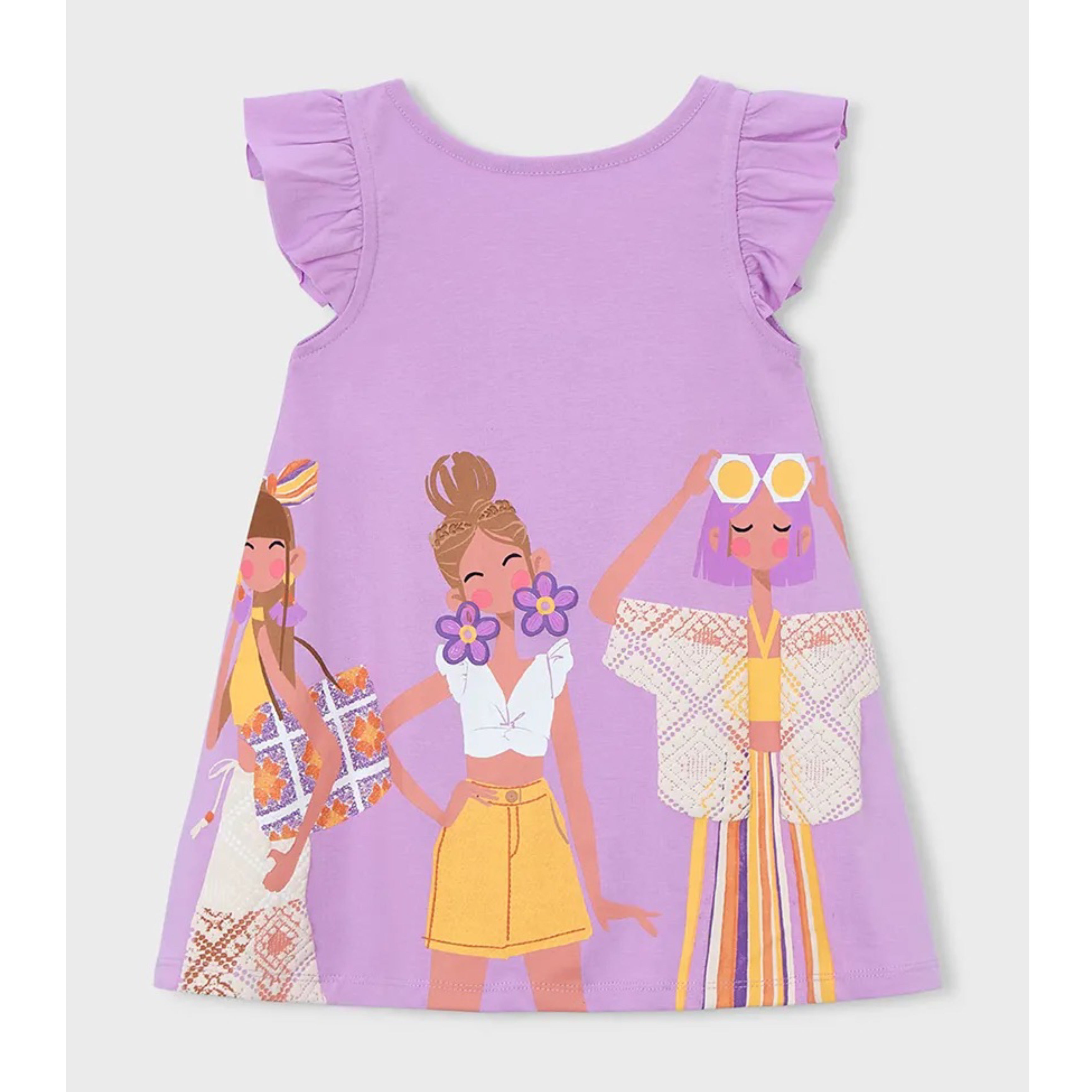 This charming Mayoral girls lilac summer dress is a standout piece for the season. Designed in a soft lavender tone, it features a beautiful illustrated print of fashionable girls across the front, adding a playful yet elegant designer feel.
