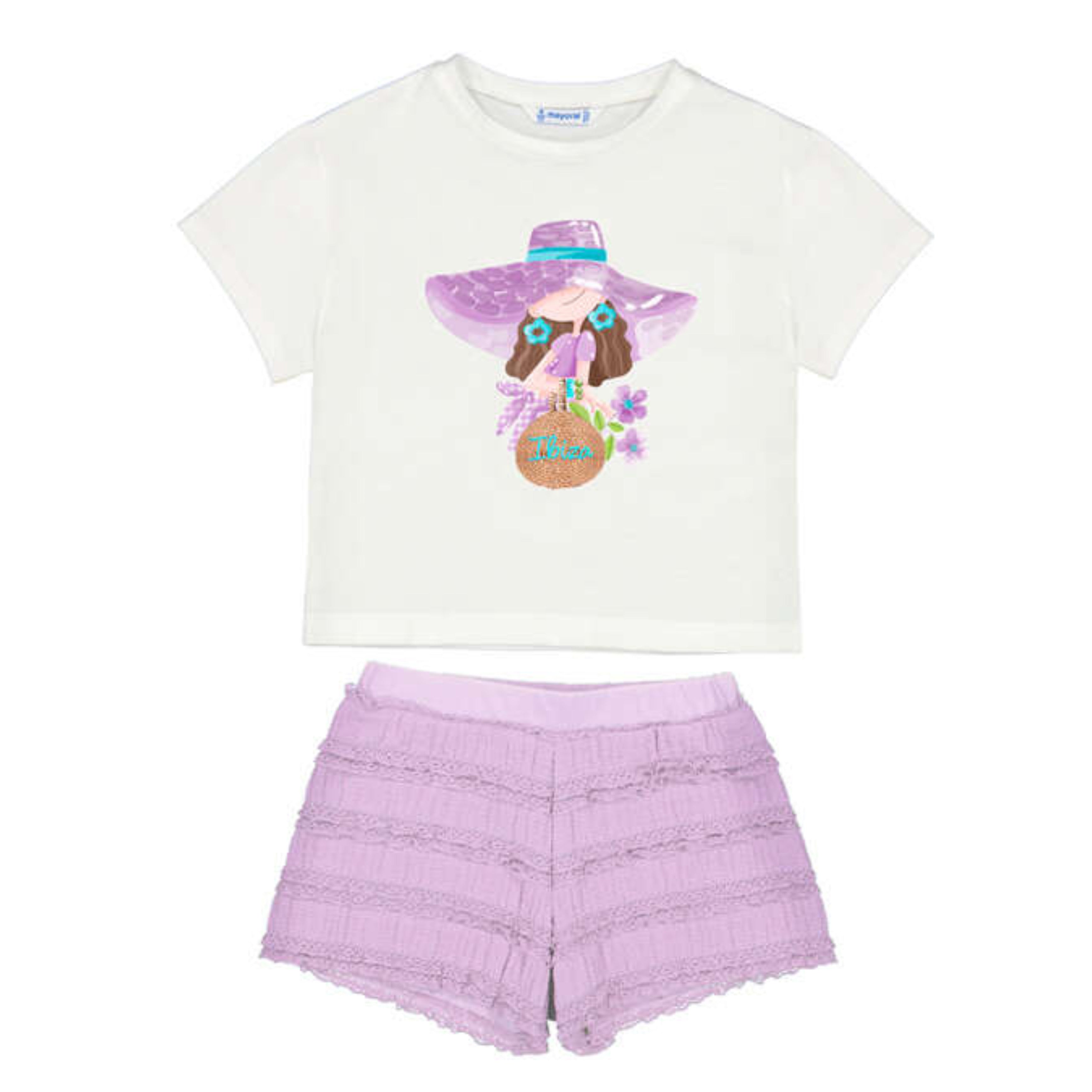 This beautiful Mayoral girls lilac tulle skirt set is a dreamy addition to any little girl’s summer wardrobe. The set features a soft ivory short-sleeved top, delicately finished with lilac chiffon flower appliqués at the neckline, paired with a floaty layered lilac tulle skirt with gentle ruffle detailing.