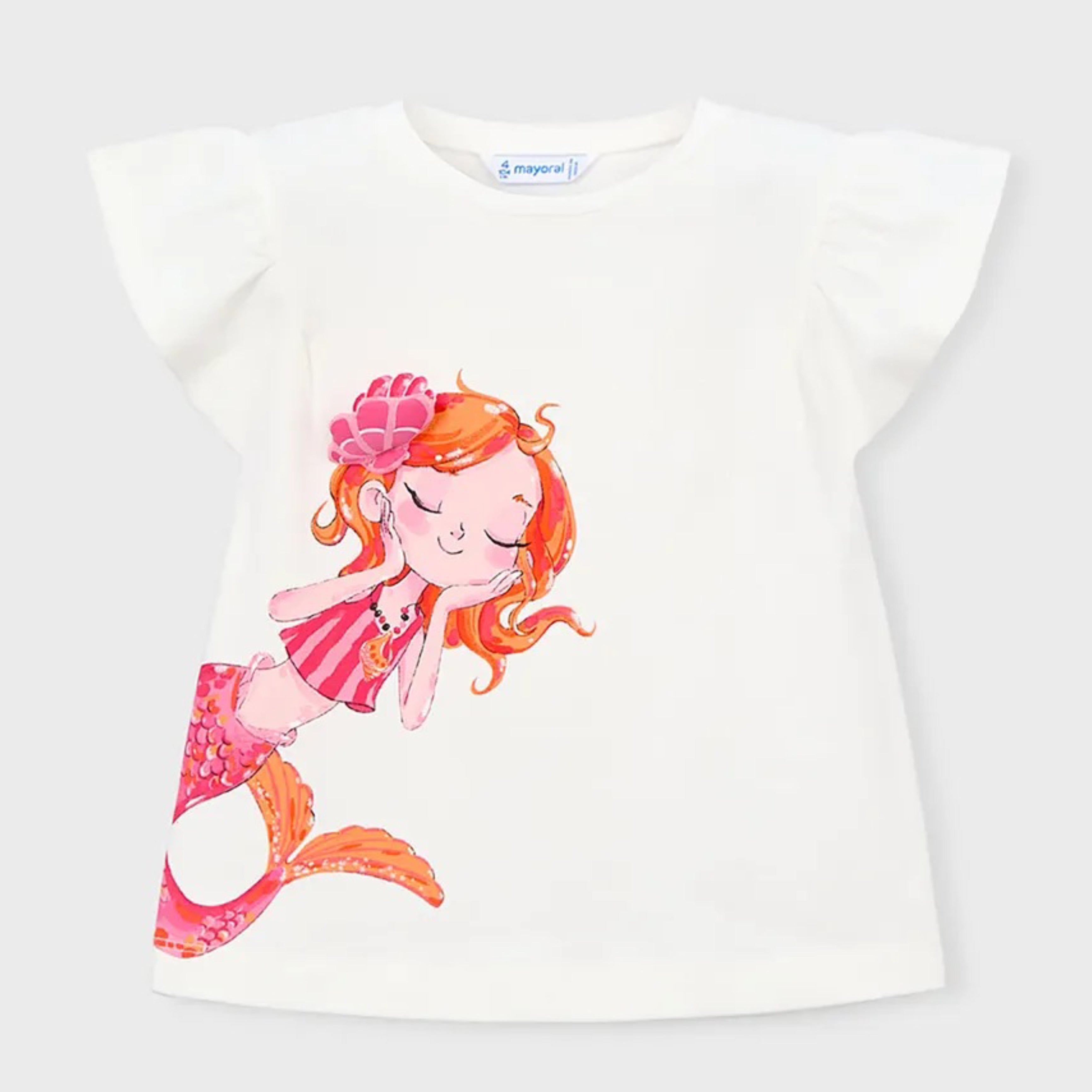Sweet, playful and perfect for sunny days, this charming Mayoral girls two-piece outfit is part of the Summer 2026 collection. The soft white cotton t-shirt features an adorable illustrated mermaid design, finished with delicate ruffle sleeves for a feminine touch. It’s paired with beautifully tailored coral pink shorts, complete with soft pleats and a decorative waist detail for a polished summer look.