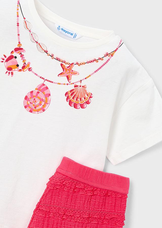 Pretty, playful and perfect for warm sunny days, this gorgeous Mayoral girls two-piece outfit is part of the Summer 2026 collection. The soft white cotton t-shirt features a charming shell necklace illustration, creating the look of layered summer jewellery for a fun yet elegant finish. It’s paired with beautifully textured red lace shorts, designed with a comfortable elasticated waistband for effortless all-day wear.