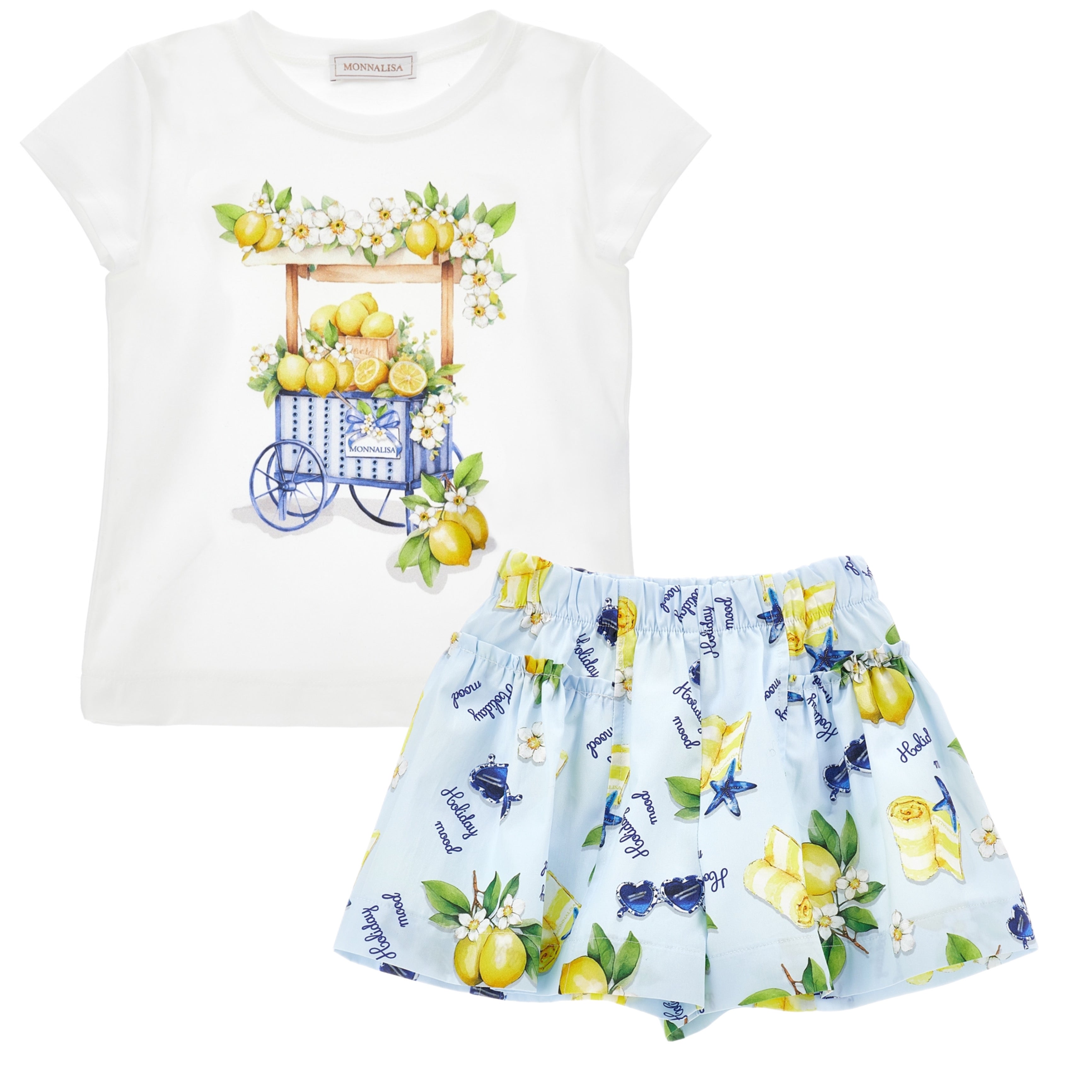Fresh, playful, and perfectly sweet. This Girls lemon print top and shorts set by Monnalisa is a summer essential. The crisp white t-shirt features a charming lemon cart print, paired with a light blue printed shorts for a coordinated and cheerful look.