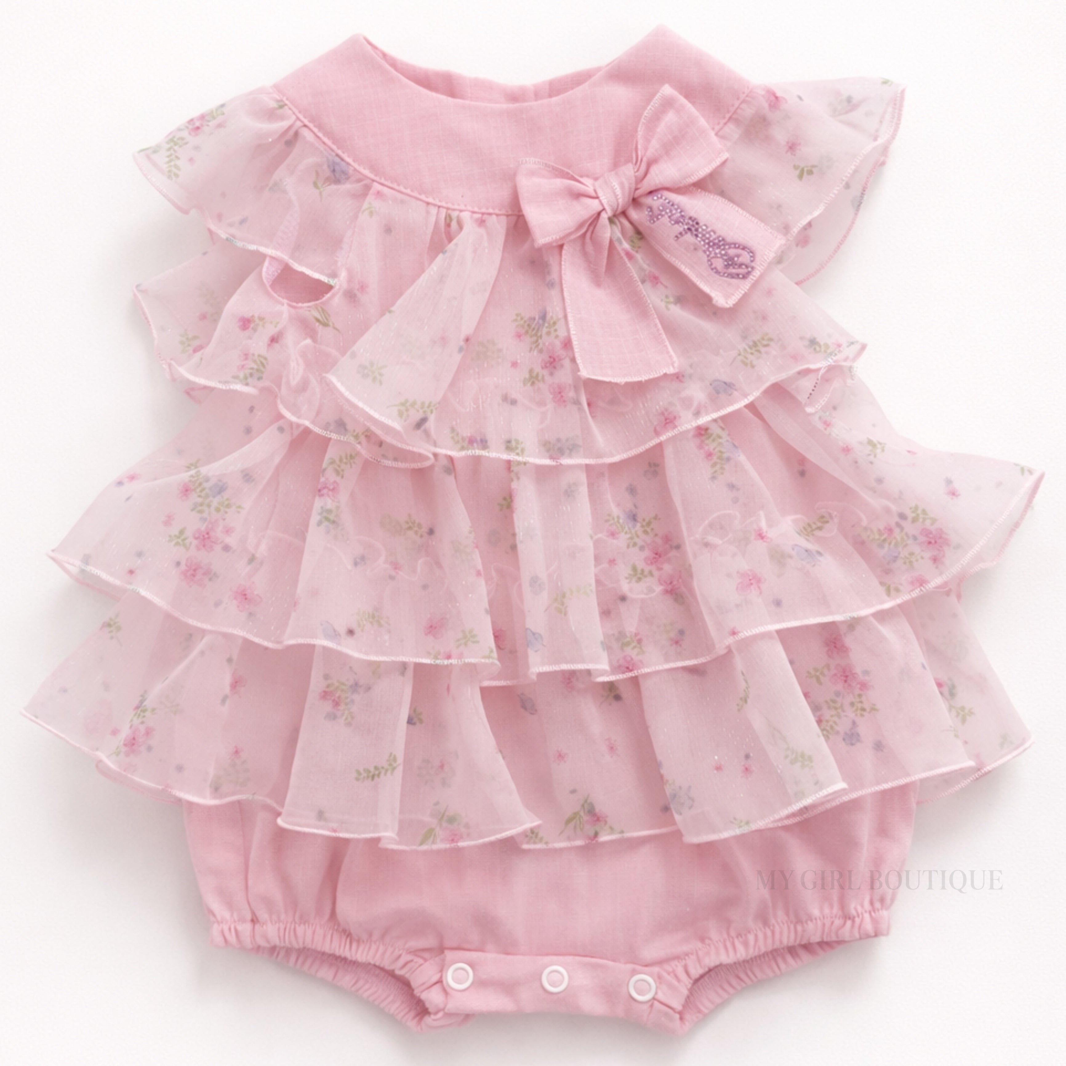 This beautiful piece features delicate pink floral fabric with layered ruffle detailing, creating a soft and romantic look. A pretty bow accent at the neckline adds a charming finishing touch, while the soft pink base keeps the outfit timeless and elegant.