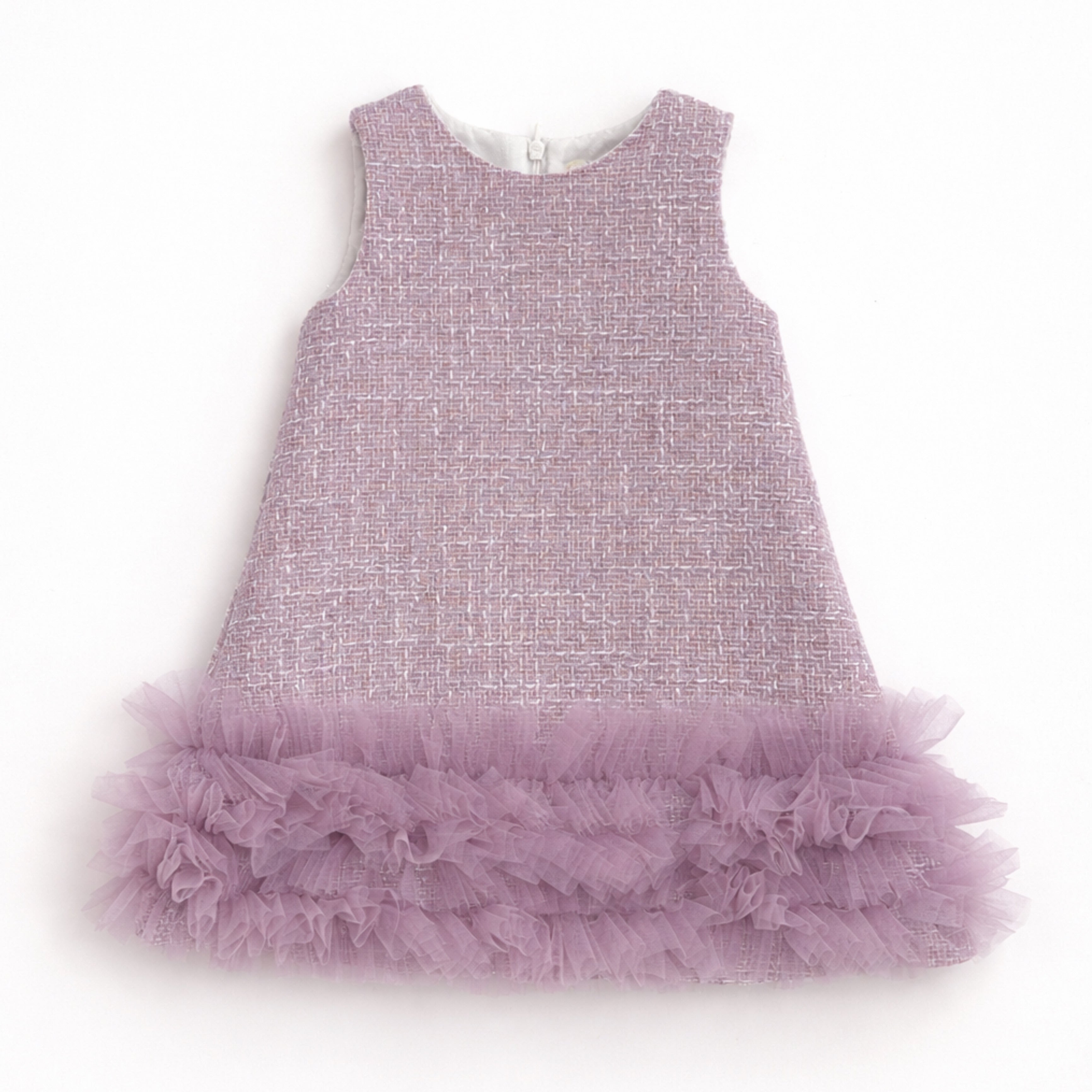 This beautiful Bimbalo lilac tweed dress is a timeless piece for little girls, combining classic elegance with delicate detailing. Crafted in a soft textured tweed fabric, the dress features a sleeveless silhouette and a statement layered tulle ruffle hem for a luxurious finish. SS26 collection.