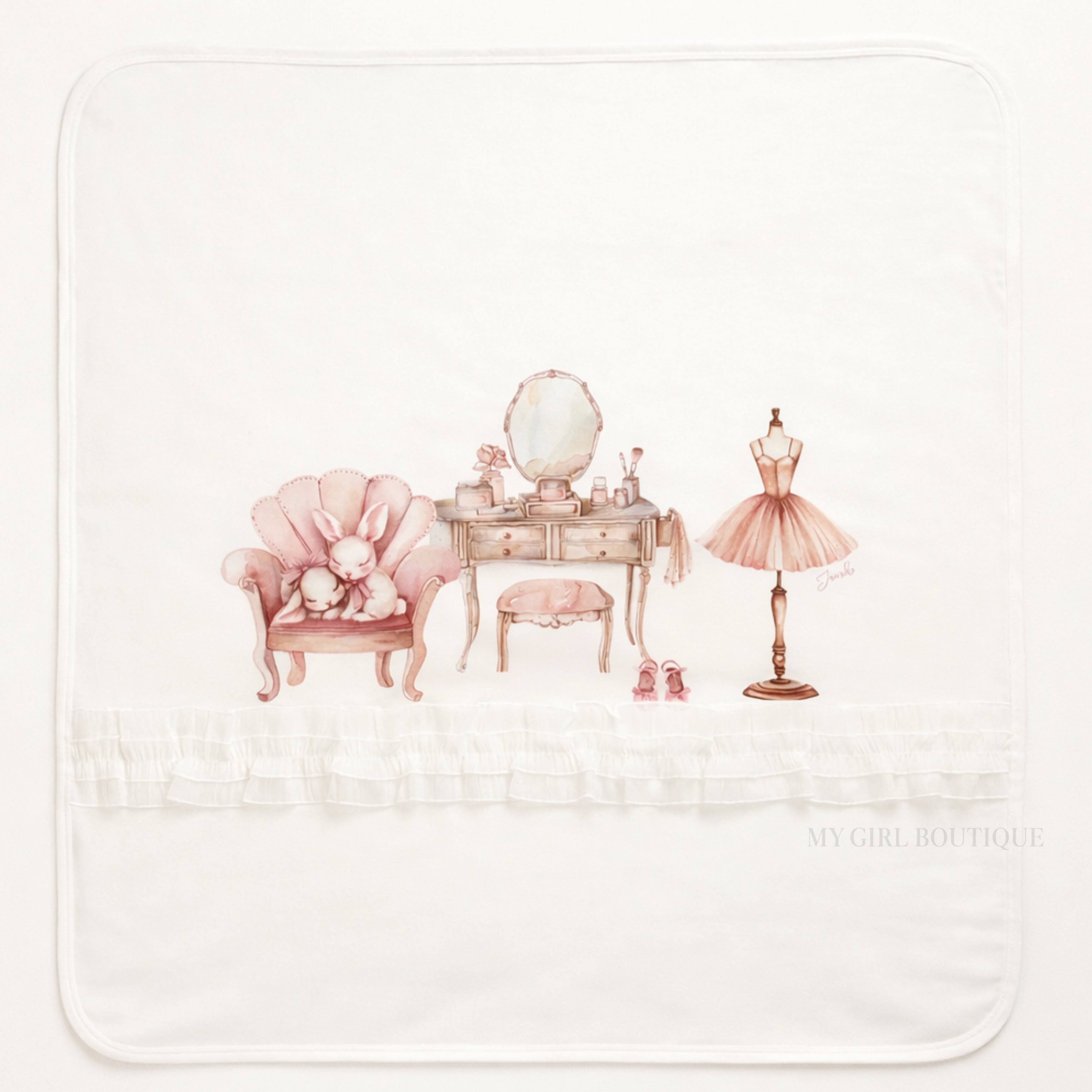 Designed in a soft white cotton, this exquisite set features a beautifully illustrated dressing-table print in delicate blush tones, creating a refined and classic look for baby girls. The babygrow is finished with a traditional Peter Pan collar and gentle frill detailing, while the matching blanket completes the set perfectly.