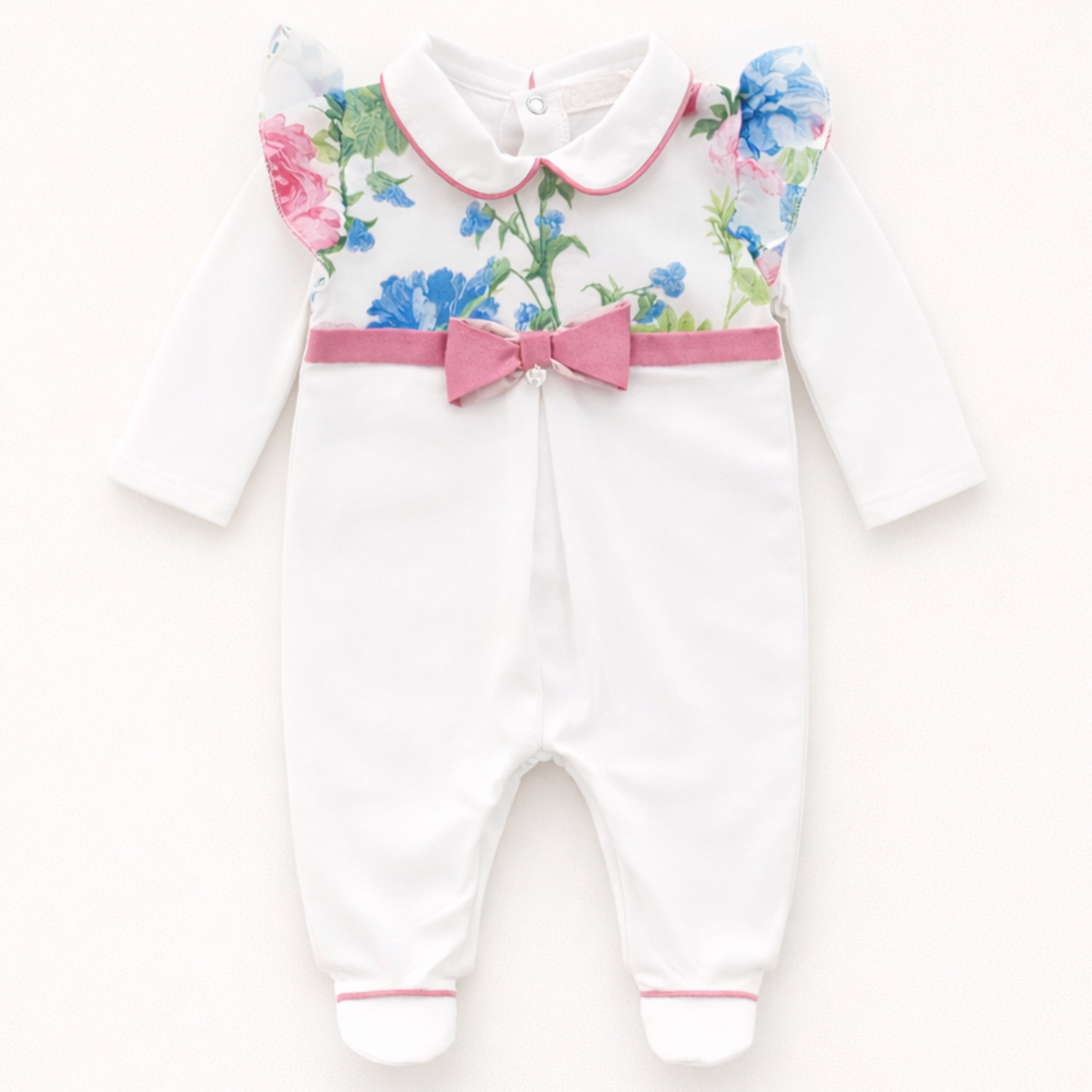 The babygrow features a soft white cotton base with a stunning floral panel across the chest and shoulders, finished with a classic Peter Pan collar and refined pink piping. A matching pink bow detail adds a charming finishing touch, while the enclosed feet ensure comfort and warmth for newborns.
