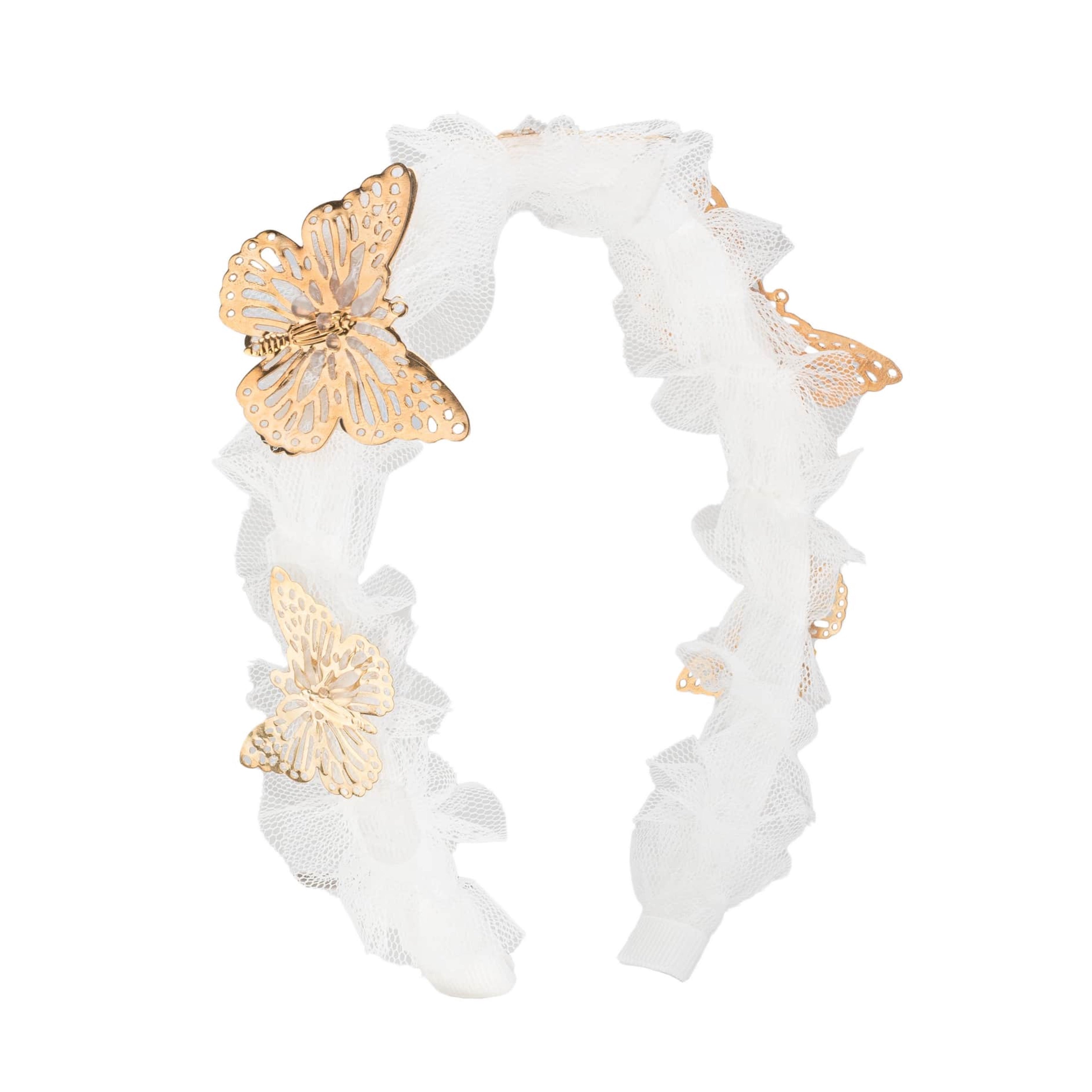 The Daga girls butterfly tulle headband from the Twinkle Flight Collection is a beautiful luxury hair accessory designed to add a magical finishing touch. Crafted in soft ivory tulle with delicate gold butterfly embellishments, it is perfect for parties, special occasions and fairy-inspired outfits.