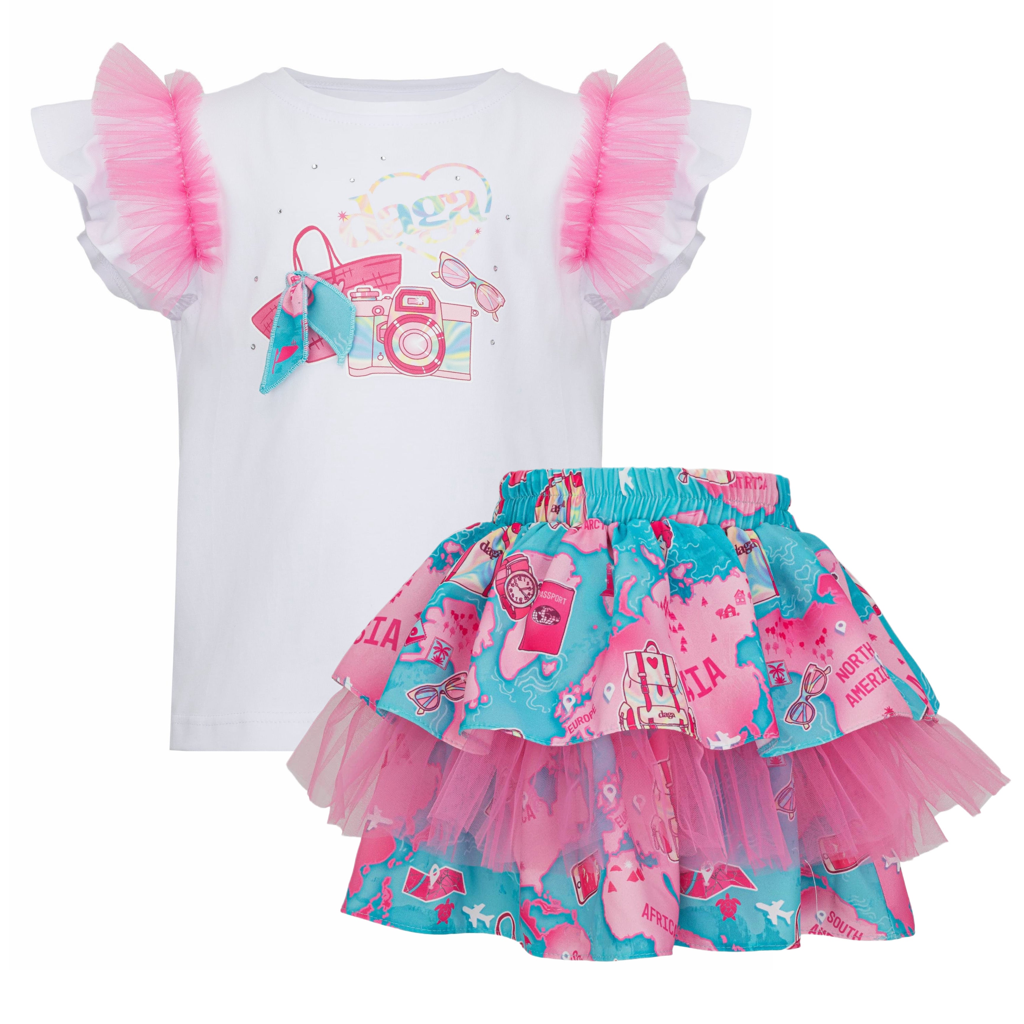 The Daga girls top and tulle skirt set from the Sugar Trip Collection is a playful designer outfit perfect for summer styling. Featuring a white top with pink tulle frill sleeves and a coordinating layered skirt in the vibrant Sugar Trip travel print, this set is both stylish and comfortable.