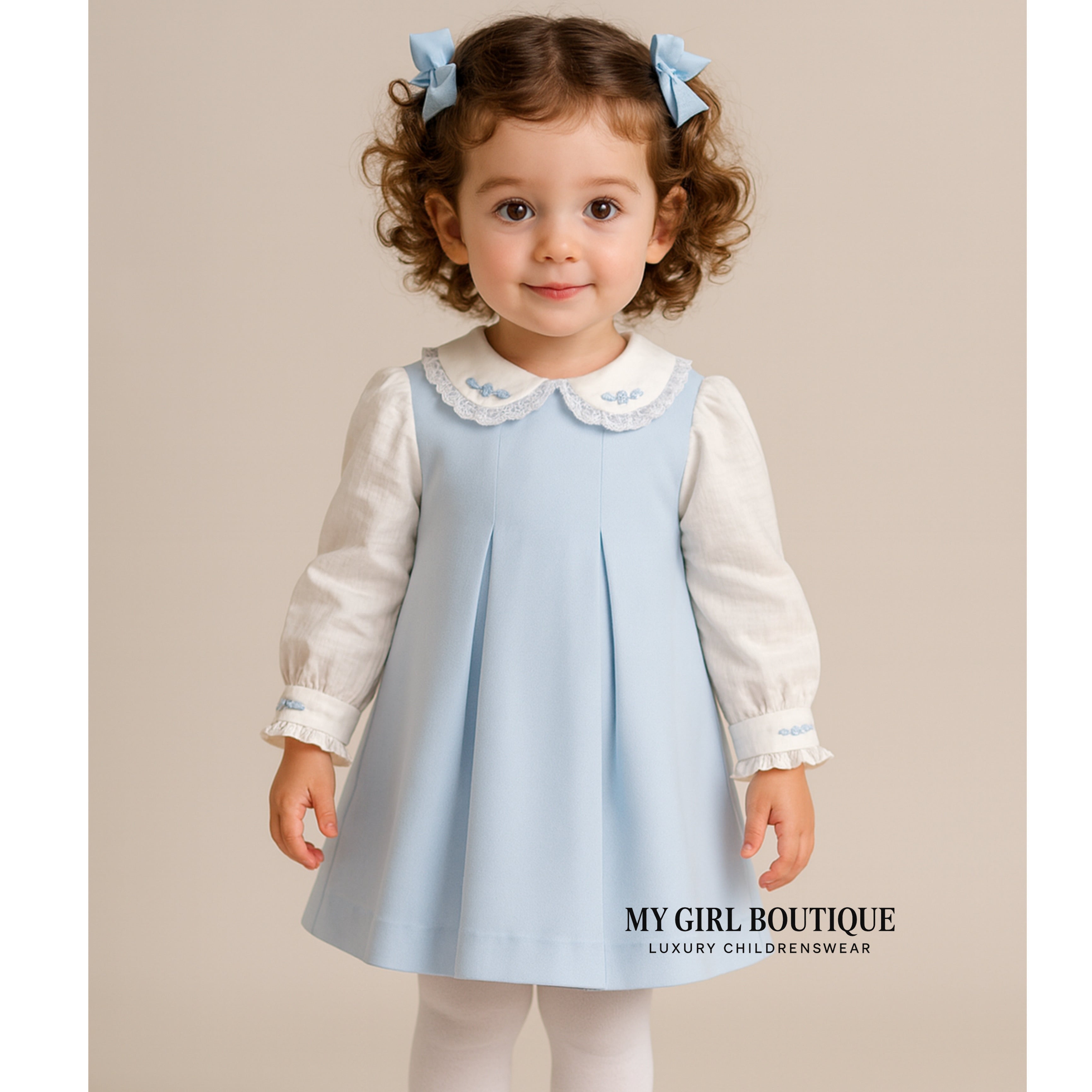 Pretty Originals AW25 traditional LIGHT BLUE pinafore dress for little girls, made in soft, slightly brushed twill, it is comfortably styled with inverted pleats. It has contrasting white sleeves and collar, delicately detailed with hand embroidered flowers and a neatly concealed zip on the back.